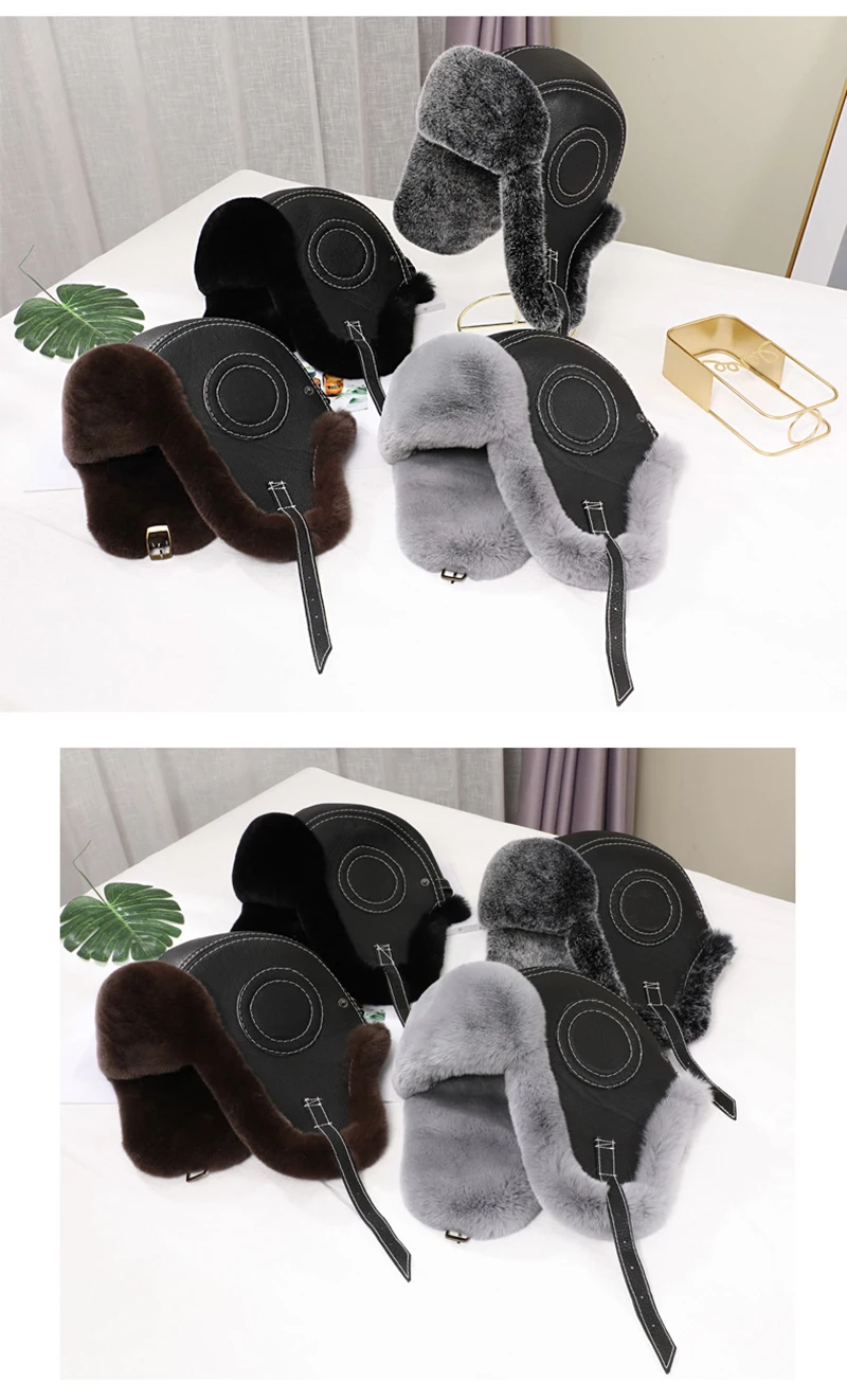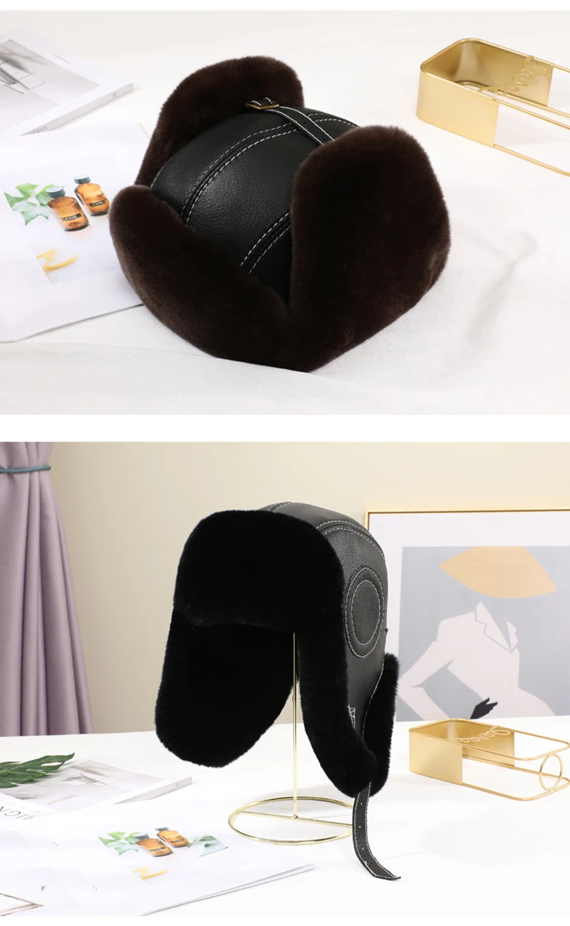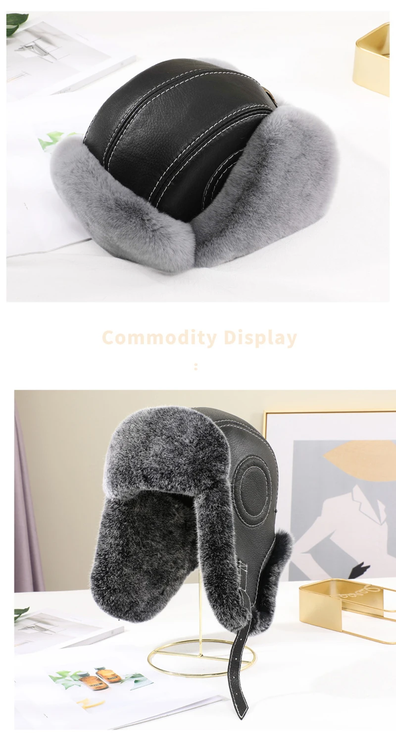 2025 Fashion Men's 100% Natural Rex Rabbit Fur Bomber Hats Winter Russian Man Warm Real Sheepskin Leather Hat Male Real Fur Caps