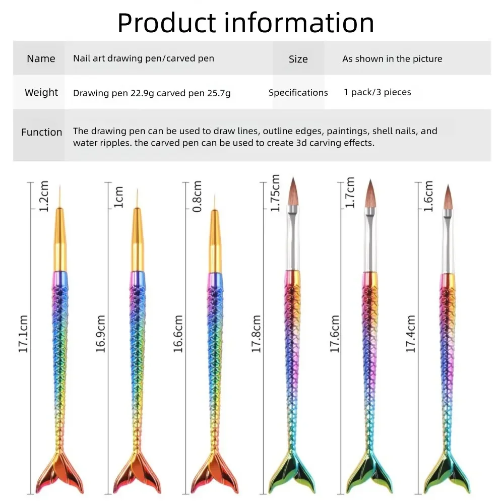 This nail brush set includes 6 mermaid gradient nail art pens made of durable ABS material, designed for color drawing, line drawing, flower carving, and light therapy applications.