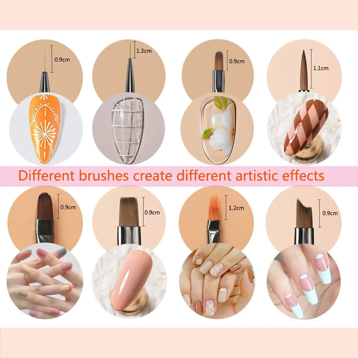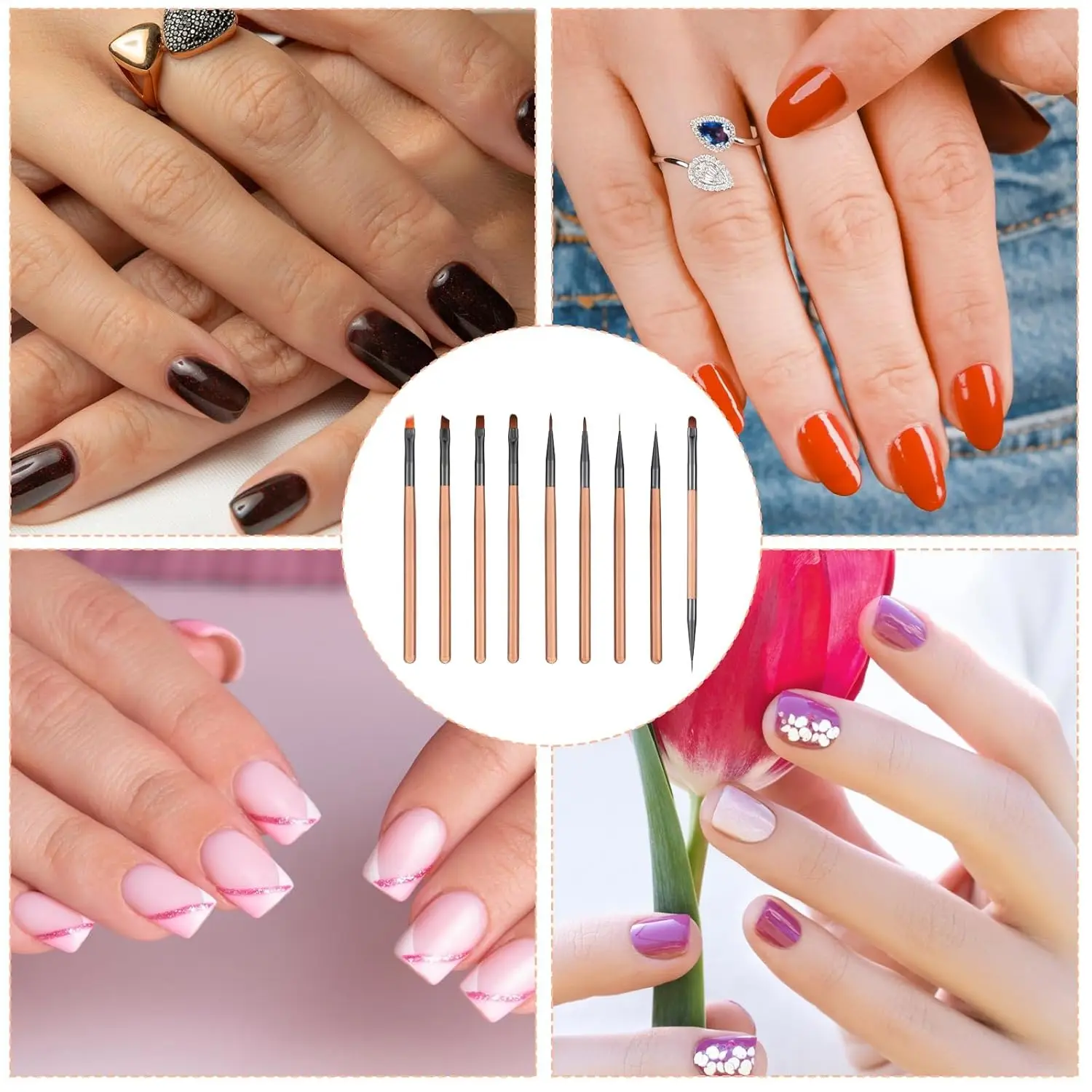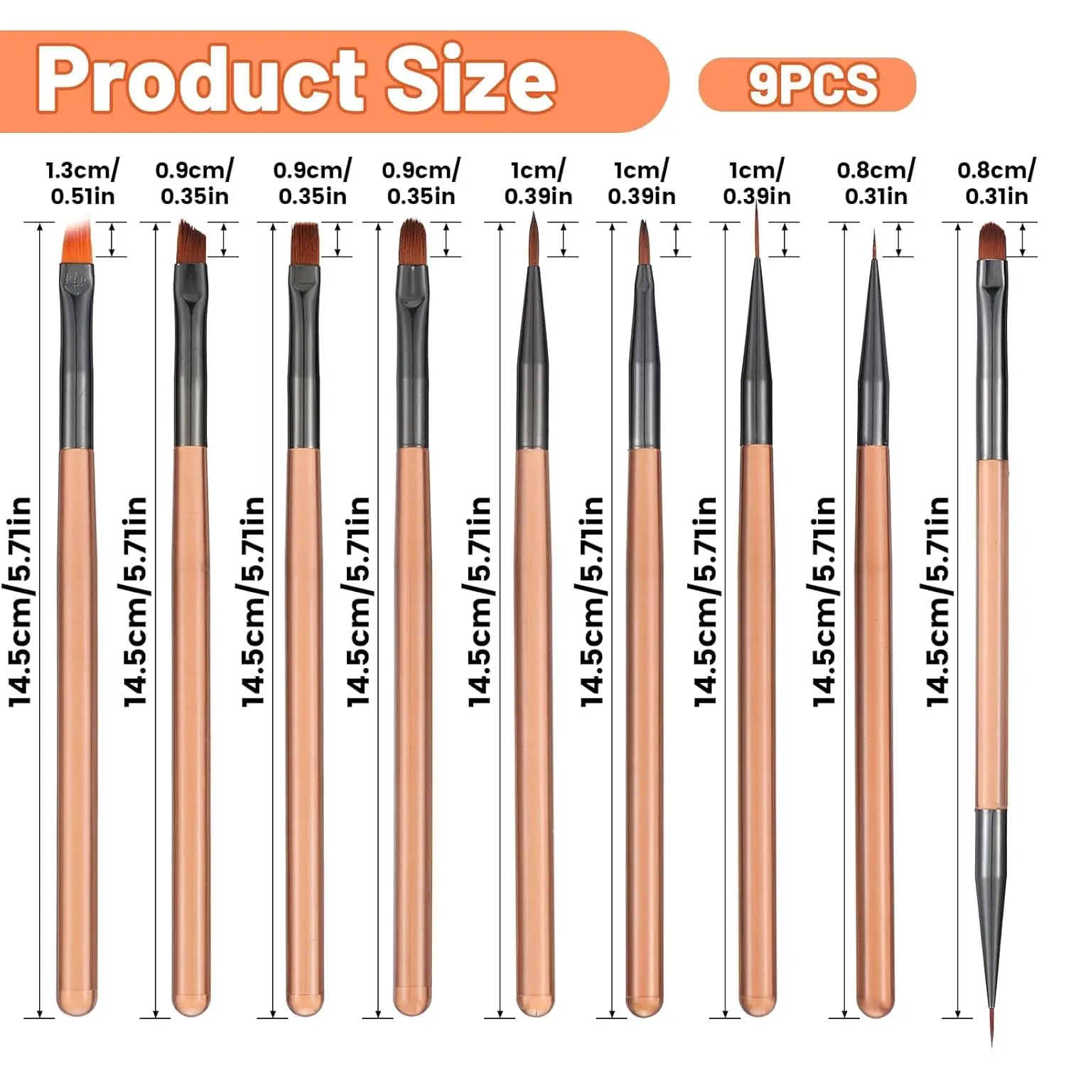 This is a 9-piece set of brown professional nail art brushes, designed to meet various nail art needs, from basic application to intricate artistic creations. Crafted from high-quality synthetic fibers, the brushes combine durability with a stylish design, making them an ideal tool for both nail artists and enthusiasts.