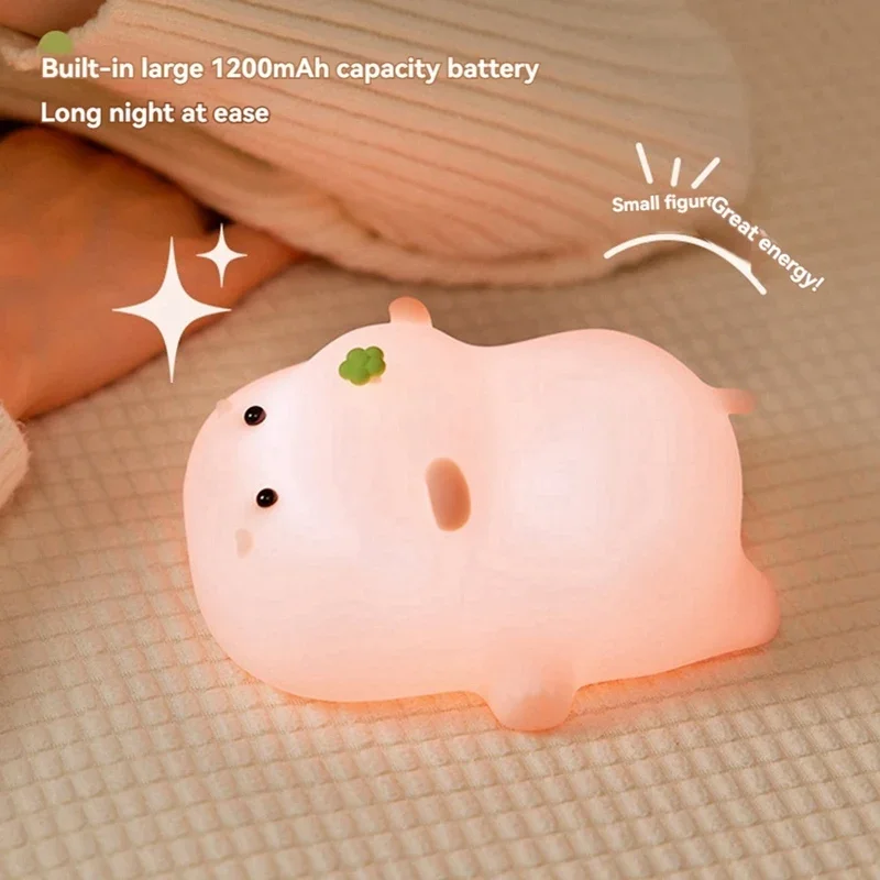 This animal-shaped night light features a plastic body with LED bulbs, powered by a rechargeable lithium battery.
