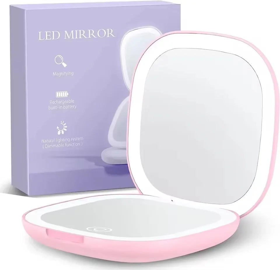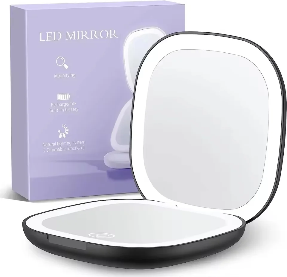 This LED pocket makeup mirror is designed for high-definition reflection and precise makeup application. Featuring a double-sided design with a 5x magnifying mirror surface and tri-color LED lights, it ensures clear visibility in any lighting condition.
