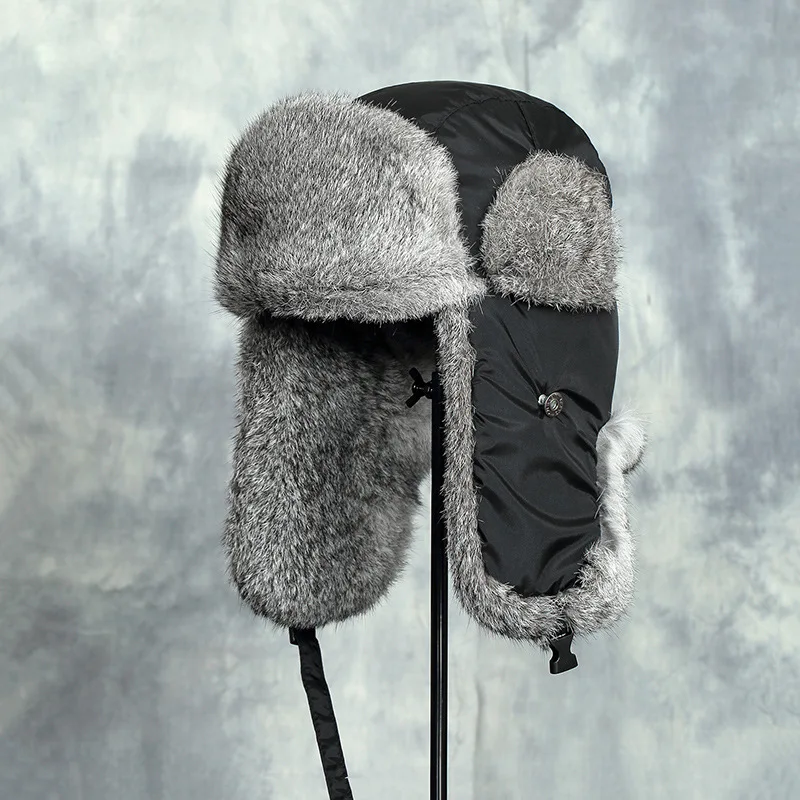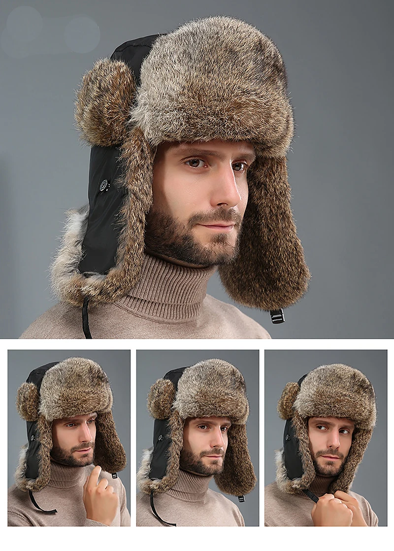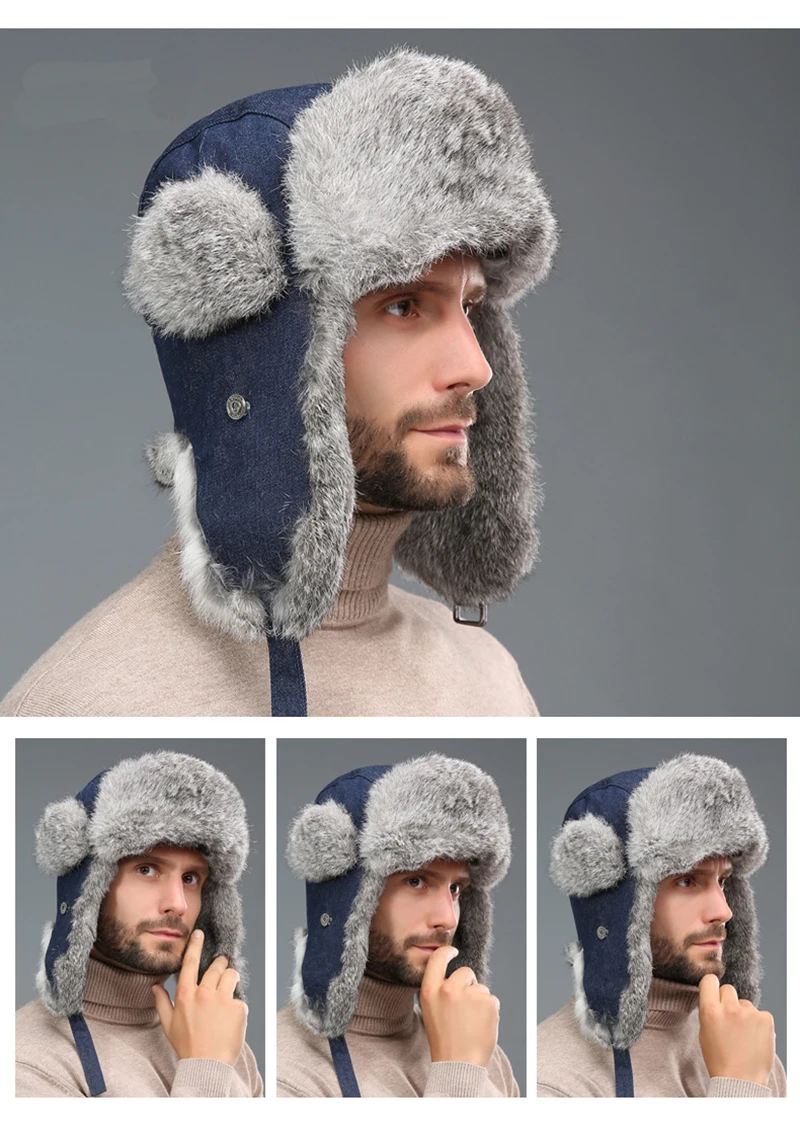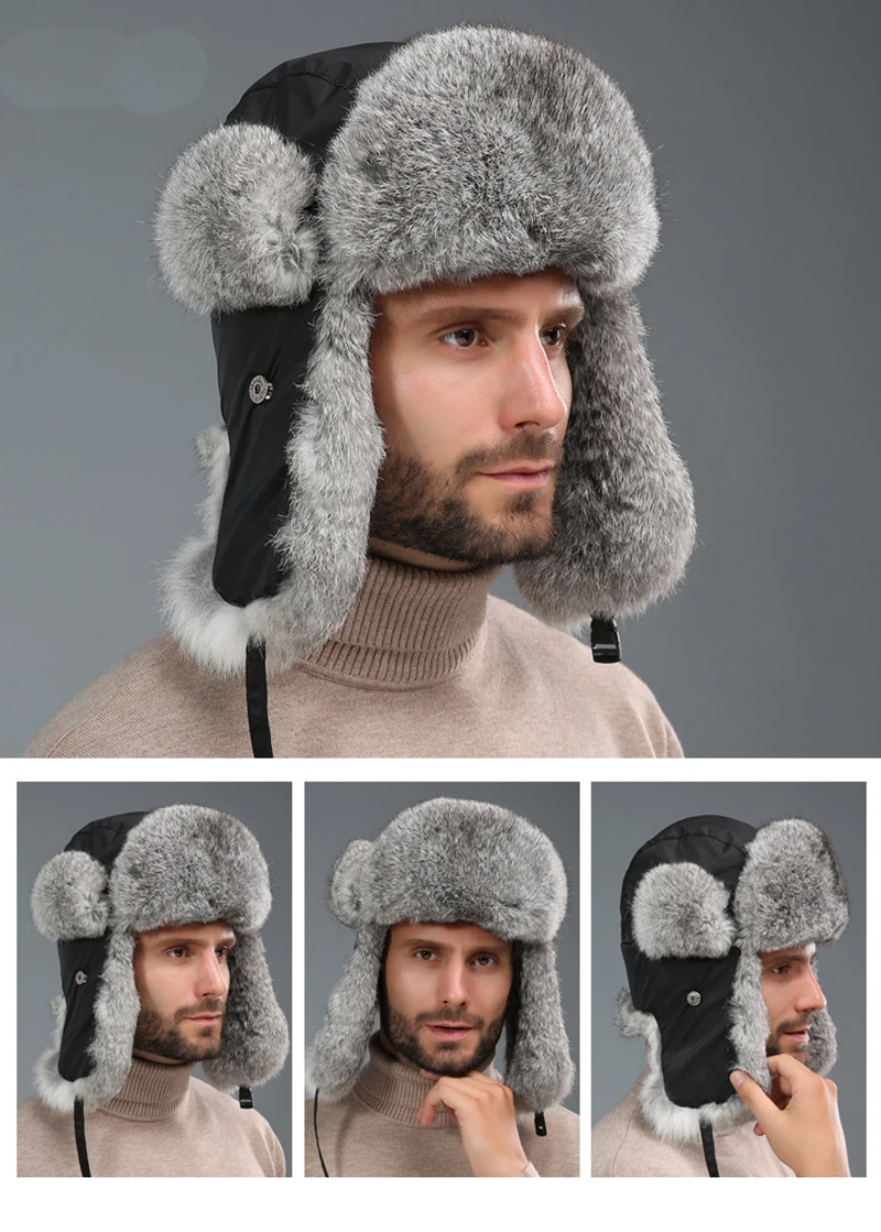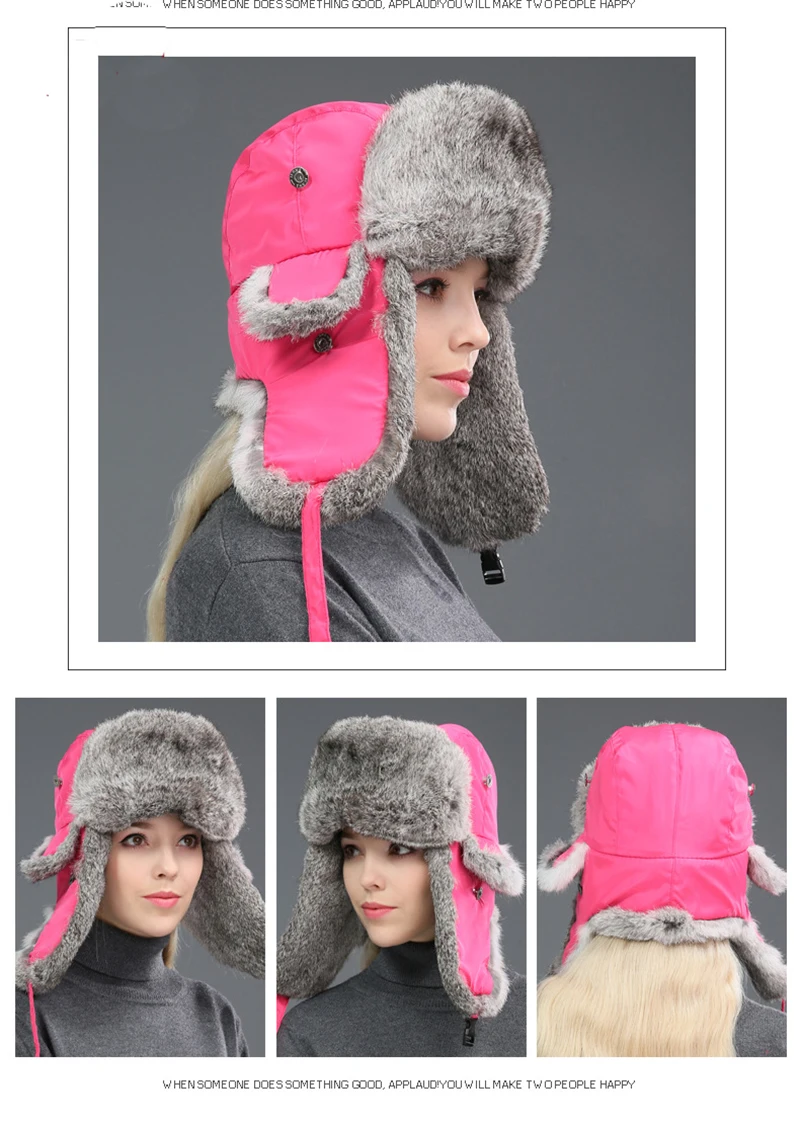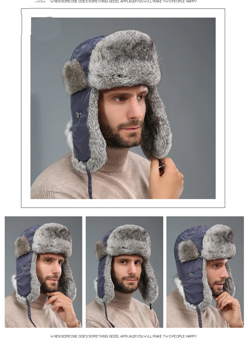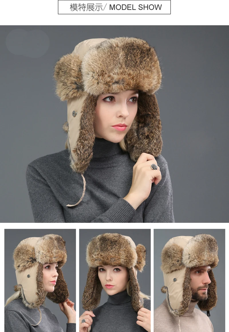 Russia Winter Real fur Hat Unisex Outdoor Windproof Super Warm Real Rabbit Fur Bomber Hats Natural Soft Natural Rabbit Fur Caps